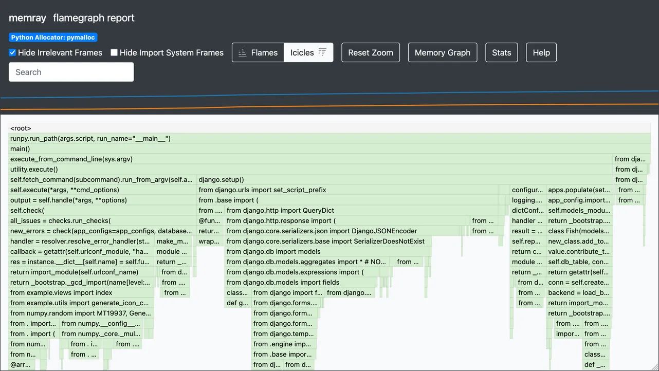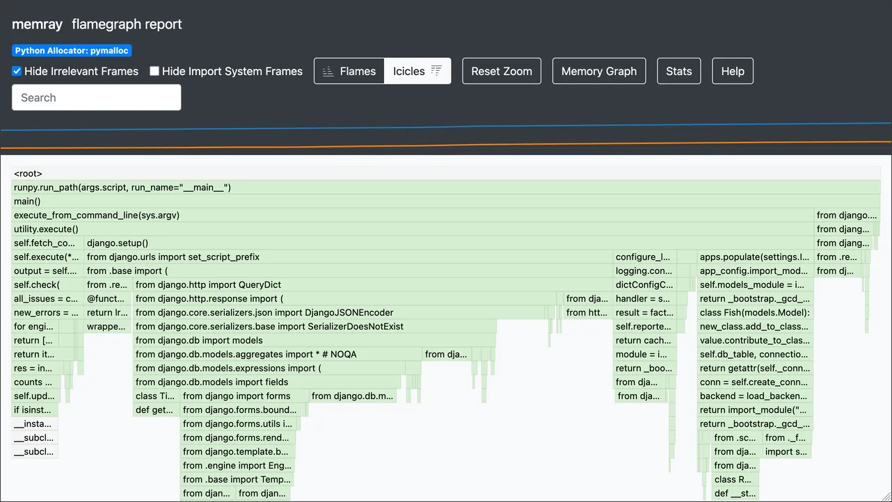 In this case, it seems the change worked and memory usage has reduced. The flame graph looks like the right ~75% of the previous one, with “icicles” for regular parts of Django’s startup process, such as importing django.db.models and running configure_logging(). And the Stats dialog shows a lower peak value.