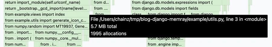 In the above example, I already narrowed in on a potential issue. The line from numpy.random import ... allocates 5.7 MB of memory, about 23% of the peak usage of 25.2 MB. This import occurs in example/utils.py, on line 3. Let’s look at that code now:
