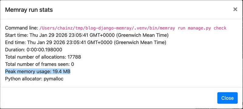 Memray can profile any Python command with its memray run command. For a Django project, I suggest you start by profiling the check management command, which loads your project and then runs system checks. This is a good approximation of the minimum work required to start up your Django app, imposed on every server load and management command execution.